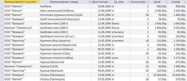 Эти объекты служат для извлечения данных из таблиц и предоставления их пользователю в удобном виде. С помощью запросов выполняют такие операции как отбор данных, их сортировку и фильтрацию. С помощью запросов можно выполнять преобразования данных по заданному алгоритму, создавать новые таблицы, выполнять автоматическое наполнения таблиц данными, импортированными из других источников, выполнять простейшие вычисления в таблицах и многое другое. Для реализации необходимых функции по ведению базы данных были созданы запросы: «Покупка покупателями продуктов по видам» «Покупка товаров по датам за определенный срок» Запрос «По видам продукции». Запрос «По видам продукции» построен с использованием трех таблиц. Тип запроса – выборка. На его основе формируется таблица, показанная на рис. 12.