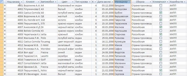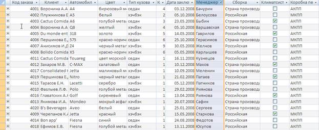 Для того чтобы произвести сортировку таблицы базы данных по значениям одного или нескольких полей, выполните следующие действия: 1. Откройте таблицу Заказы в режиме таблицы. 2. Щелкните по любой ячейке столбца «Менеджеры», по которому нужно отсортировать таблицу (рисунок 1).