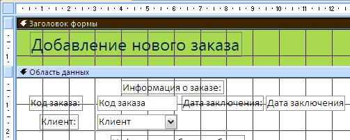 Рисунок 10 – Пустая форма в Конструкторе форм 3. 4. Добавьте в форму строку заголовка. Для этого нажмите кнопку (Заголовок) в группе Элементы управления, щелктите мышью в верхней части формы и введите текст заголовка (В вашем случае наберите, «Добавление нового заказа»). Окончив ввод, нажмите клавишу Enter. Результат представлен на рисунке 11.