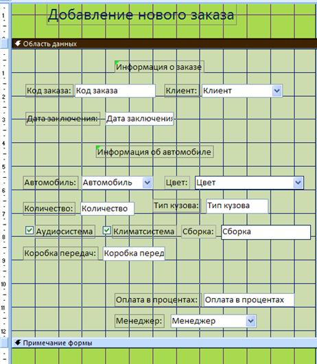 10. Добавьте на форму первую пояснительную надпись. Для этого перейдите на вкладку Конструктор и в группе Элементы управления щелкните кнопку Надпись. После этого щелкните мышью в верхней части раздела Область данных после полей «Код заказа», «Клиент» и «Дата заключения». Введите текст надписи «Информация об автомобиле». Результат представлен на рисунке 15.