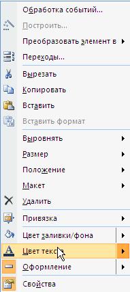 20. Измените цвет фона и шрифта для заголовка формы «Дабовление нового заказа». Для установки цвета текста щелкните по заголовку правой кнопкой мыши, выберите в контекстном меню (рисунок 22) пункт Цвет текста и щелкните по понтравившемуся вам цвету (например, темно-синий). Цвет заголовка изменится будет иметь выбранный вами цвет.