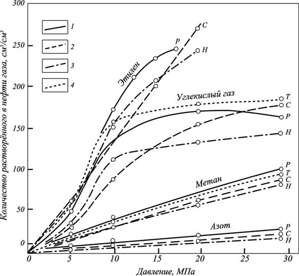 Рис. 2.5. Изотермы растворимости газов при температуре 50оС в нефтях: 1. – ромашкинская (Р); 2. – сураханская (С); 3. – небитдагская (Н); 4. – туймазинская (Т) по данным Т.П. Сафроновой и Т.П. Жузе