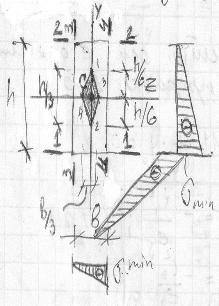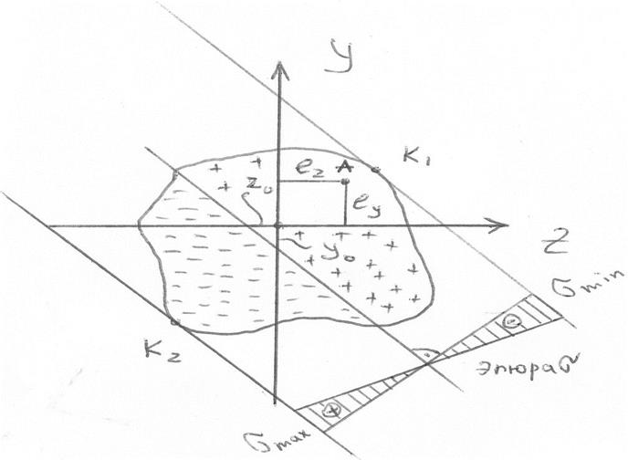 1) Z=0 2) Y=0 Выражение (17.2) определяет точки пересечения нейтральной оси с осями координат Замечание: полюс силы т. А и нейтральная ось располагаются по разные стороны от центра тяжести сечения Как следует из выражения (17.1) эпюра нормальных напряжений- это прямая Определяем точки экстрем. напряжений в) Ядро сечения Ядром сечения называется геометрическое место полюсов силы Р, при котором нейтральная ось касается сечения. В этом случае эпюра нормальных напряжений однозначна (при сжатии отрицательна)