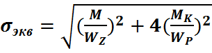 А) Данный вид деформации возникает при нагружении ломаных стержней или валов редукторов. В данном виде деформации в поперечном сечении изгибающие и крутящие моменты, которые продолжаются соответственно нормальными и касательными напряжениями. При расчете прочности нельзя воспользоваться принципом суперпозиции, т.к. действующие напряжения разнородны(т.е. нормальные и кас-ые) Нормальное напряжение от изгиба опр: Кас-ое напряжение: В данном случае для реализации условий прочности пользуются данными эквивалентного напряжения в результате учета нормального и касательного напряжений. Эквивалентные напряжения получают на основании выводов теории прочности. В настоящее время рассмотренный вид деформации наиболее достоверно описывается 3 и 4-ой теориями прочности. Эти теории определяют условие прочности следующими выражениями: III IV В) И 3-я и 4-я теории прочности считаются равноценными. Определяемые по выр. (1) или (2) эквивалентные напряжения в опасном сечении учитываются в условии прочности