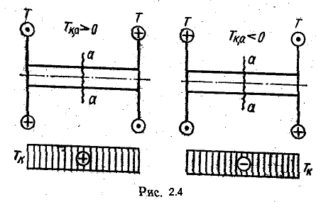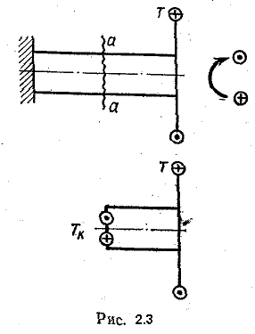 Для определения крутящих моментов Тк возникающих в сечениях вала под действием внешних скручивающих моментов или поперечной нагрузки, будем применять метод сечений. Сделаем мысленный разрез стержня (рис. 2.3), например по а - а, отбросим одну часть стержня, в данном случае левую, и рассмотрим равновесие оставшейся правой части.