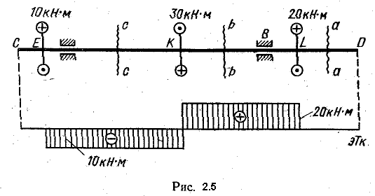 Построение эпюры крутящих моментов поясним на следующем примере (рис. 2.5): рассмотрим вал CD, опирающийся на подшипники B и A и находящийся в равновесии под действием приложенных к нему в сечениях E, K и L моментов. Сделав сечение а - а где-либо на участке DL и рассмотрев равновесие правой отсеченной части, убедимся, что Тк = 0. Если мы сделаем затем сечение b - b в любом месте участка LK, то из условия равновесия правой от сечения части получим Тк = 20 кН * м.