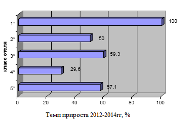 Рисунок 9. Темп прироста отелей в Казахстане по категориям с 2012 по 2014 гг. Приложение - составлено на основе данных источника[3; 58]