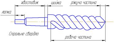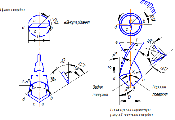 Отвори обробляють переважно на свердлильних і розточувальних верстатах. Найбільш широке розповсюдження при обробці отворів отримали операції свердлення, зенкерування, розвертання, розточування, нарізання внутрішньої різьби і обробки центрових отворів. При обробці бобишок навколо отворів застосовують цекування. Залежно від необхідної чистоти і точності обробки обмежуються одним свердлінням, або здійснюють послідовно свердління-зенкування і розвертання. Основними типами інструментів для обробки отворів є свердла, зенкери, розвертки. Типи свердел. Залежно від конструкції ріжучої частини розрізняють наступні типи свердел: перові, спіральні, для глибокого свердління і центрувальні. Найбільш прості у виготовленні перові свердла представляють собою пластинку з ріжучими кромками, розташованими симетрично одна до одної і до осі свердла. Ці свердла застосовують для обробки отворів малого (0, 2-1мм) і великого (більше 80мм) діаметрів, а також при ремонті. Ріжучі кромки ab і cd утворюють кут 2φ від 800 (у м'якого) до 1400 (для твердого). В місці перетину ріжучих кромок утворюється поперечна ріжуча кромка са під кутом ψ = 55-600. Найбільш поширені спіральні свердла. На рисунку показані геометричні параметри ріжучої частини свердла. Свердло є складнішим інструментом, ніж різець. Воно має 5 лез: 2 головних a - b і c - d, 2 допоміжних b - е і d - f і лезо перемички a - с. При різанні стрічки знижують шорсткість стінок отвору. Основним параметром свердла є кут при вершині 2φ, кут нахилу гвинтової канавки ω, кути α і γ. В головній січній площині свердло має форму різця з кутами α і γ. Перетин передніх і задніх поверхонь утворює головні ріжучі кромки. По передніх гвинтових поверхнях сходить стружка. Задні поверхні зубів свердла при своєму перетині утворюють поперечну ріжучу кромку.