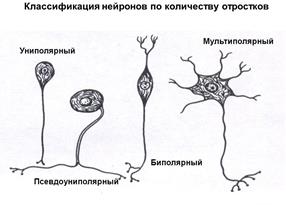 Клеток нейроглии примерно в 10 раз больше, чем нейронов. В отличие от нейронов глиальные клетки сохраняют способность к делению в течение всей жизни. Классификация нейронов. По количеству отростков нейроны делятся на: ♦ униполярные — с одним отростком;