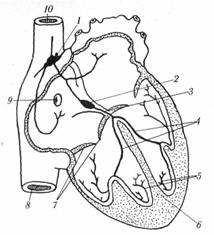 Рис.81. Проводящая система сердца (схема): 1 — сннусно-предсердный узел (Кейт-Флека); 2 — предсердно-желудочковый узел (Ашоф-Товара); 3 — предсердно-желудочковый пучок (пучок Гиса); 4— правая и левая ножка предсердно-желудочкового пучка; 5 — нервно-мышечные волокна; 6 — межжелудочковая перегородка; 7 — правый предсердно-желудочковый клапан; 8 — нижняя полая вена: 9 — отверстие венечной пазухи сердца; 10 — верхняя полая вена. Важнейший центр проводящей системы сердца— синусно-предсердный узел, или синусный узел(Кейт-Флека) — пейсмекер первого порядка —располагается в правом предсердии в месте впадения верхней полой вены и генерирует около 60 имп./мин. Второй центр — предсердно-желудочковый узел, или атриовентрикулярный узел(Ашоф-Товара) — пейсмекер второго порядка —находится в перегородке на границе предсердий и желудочков и генерирует приблизительно 40 имп./мин. Оба узла соединены атипичными мышечными волокнами — волокнами Пуркенье. От предсердно-желудочкового узла отходит пучок Гиса — пейсмекер третьего порядка, который, делясь на две ножки, оканчивается на сосочковых мышцах желудочков и генерирует 20 имп./мин. Необходимым условием для обеспечения работы сердца является анатомическая целостность его проводящей системы. В нормальных условиях функционирует только синусно-предсердный узел. При его остановке (например, из-за местного нарушения кровообращения) роль водителя ритма берет на себя предсердно-желудочковый узел, с более низкой способностью к автоматии. Роль нервной системы заключается в изменении частоты и силы сокращений в зависимости от потребностей организма. Нарушения проводящей системы сердца заключаются в образовании неполного или полного сердечного блока. При неполном сердечном блоке понижена возбудимость атриовентрикулярного узла, через который проходят каждый второй или третий импульс, при этом желудочки сокращаются в 2-3 раза медленнее предсердий. При полном сердечном блоке поражается пучок Гиса и импульсы не проходят в желудочки сердца. При этом пробуждается свой собственный автоматизм желудочков, который не соответствует ритму предсердий, наблюдается рассогласованность сокращений предсердий и желудочков. У некоторых людей наблюдаются перебои сердца, когда за двумя следующими друг за другом сокращениями наступает длительная пауза — это обусловлено нарушением деятельности проводящей системы сердца. Благодаря автоматии сердца, в определенных условиях, обеспечивается длительное ритмическое его сокращение при изоляции из тела. ИННЕРВАЦИЯ СЕРДЦА осуществляется за счет интрамуральных сердечных сплетений, образованных ветвями шейно-грудного нервного сплетения и скоплениями нервных клеток. Интрамуральные нервные сплетения расположены во всех слоях сердца, но самое мощное лежит под эпикардом. Шейно-грудное нервное сплетение формируется из сердечных нервов от симпатического ствола и сердечных ветвей от блуждающих нервов. Таким образом, сердце получает чувствительную, симпатическую и парасимпатическую иннервацию. ФИЗИОЛОГИЯ СЕРДЦА Фазы сердечной деятельности, работа сердца. Односторонность тока крови зависит от последовательного сокращения отделов сердца и от его клапанного аппарата. Деятельность сердца состоит из трех фаз. Первая фаза — систола (сокращение) предсердий, при которой 