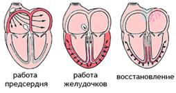 Сократимость сердечной мышцы имеет свои особенности в результате строения сердца. Первыми сокращаются мышцы предсердий, По ним возбуждение распространяется со скоростью 0, 8-1, 0 м/с. Затем сокращаются сосочковые мышцы и субэндокардиальный слой мышц желудочков. И только потом сокращаются внутренние слои желудочков, обеспечивающие продвижение крови из полостей желудочков в аорту и легочный ствол. Их скорость проведения возбуждения 0, 8-0, 9 м/с. При раздражении сердечной мышцы пороговым раздражением она отвечает максимальным сокращением и, как всякая мышца, после возбуждения на некоторое время становится не возбудимой и называется рефракторным периодом и длится в сердечной мышце в течение всей систолы. Сердечные сокращения возникают от импульсов синусного узла после рефракторного периода. Если нанести раздражение желудочку сердца после рефракторного периода, т.е. после систолы, но прежде импульса с синусного узла, то сердце ответит внеочередным сокращением — экстрасистолой. После экстрасистолы наступает более длительная компенсаторная пауза, которая объясняется тем, что очередной импульс с синусного узла попадает в рефракторный период экстрасистолы желудочков и пропадает. Электрические явления в сердце и их регистрация. В покое на наружной поверхности клетки (миокарда) — положительный (+) электрический заряд в результате перевеса катионов Na+; внутренняя поверхность клеточной мембраны имеет отрицательный (—) заряд в связи с перевесом внутри клетки анионов —Cl-, HCO3 -. В этих условиях клетка — поляризована. Под влиянием возбуждения клеточная мембрана становится проницаемой для катионов Na+, которые направляются во внутрь клетки, и переносит туда свой (+) заряд. Наружная поверхность этого участка приобретает (—) заряд в связи с перевесом анионов. Этот процесс называется — деполяризацией и связан с потенциалом действия (калий-натриевый насос). Все возбудимые ткани, в том числе и сердце, при покое имеет (+) заряд, при возбуждении этот участок становится (—). При появлении электроотрицательности, между возбужденным и невозбужденным участками возникает разность потенциалов, по мере распространения возбуждения, все новые участки становятся (—) и, следовательно, в них возникает разность потенциалов. Если соединить чувствительные специальные приборы с работающим органом, то можно обнаружить ток действия, который регистрируется при деятельности органа, и сделать его запись. Метод записи токов сердца человека получил название электрокардиографии. Для записи токов сердца используют электрокардиограф. Этот прибор соединяют с правой и левой руками — первое отведение; затем с правой рукой и левой ногой — второе отведение; с левой рукой и левой ногой — третье отведение. При записи на движущейся ленте получается кривая — электрокардиограмма (ЭКГ) (рис.82).