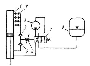 Установки з використанням в якості врівноважуючого пристрою гідропневматичного акумулятора виконуються за закритою чи комбінованою схемою, в котрий використовуються як гідродинамічні, так і гідростатичні насоси. Тип застосовуваного насоса на структуру гідравлічної схеми істотно не впливає: він визначає лише динамічні характеристики установки і, що особливо важливо, робочий тиск, а, отже, і габарити та масу елементів установки. Гідропривідні установки із закритою схемою (рисунок 1.10.2) включають силовий орган – гідроциліндр 1, пневматичний акумулятор 8, блок привода – силовий насос 3 і розподільний золотник 7, гідравлічну систему реверсування, що складається з кранів 2, встановлених на керуючих комунікаціях, зворотних клапанів 4, 5 і регульованого дроселя 6, підключених до керуючої порожнини силового золотника 7. Установки цього типу включають не показану на схемі порівняно складну систему компенсації витоків робочої рідини через ущільнення силового насоса і силового органа, що забезпечує їхнє повернення в гідросистему, а також джерело стисненого газу для підтримання тиску в акумуляторі на потрібному рівні, оскільки в процесі експлуатації відбуваються витоки газу.