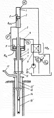 Особливе місце серед гідропривідних установок займають приводи з використанням колони НКТ, у якості врівноважувального вантажу, для чого ця колона підвішується до циліндра, що врівноважує. Крім цього принципова схема установки забезпечує можливість компонування всіх її вузлів у вигляді моноблока, що монтується безпосередньо на колонній головці свердловини. Таким чином, уперше усувається необхідність у фундаменті. Установка складається з наземної і підземної частин – привода й внутрішньосвердловинного устаткування (рисунок 1.10.9). Привід має корпус (на рисунку не показаний), що монтується на колонній голівці свердловини. У верхній частині корпусу розміщений силовий орган – штанговий гідроциліндр 1, поршень 2 якого з'єднаний штоком 3 і колоною штанг 12 із плунжером 14 свердловинного насоса. Нижче від силового органа розташовується пристрій, що врівноважує – трубний гідроциліндр 4, поршень якого з'єднаний порожнім наскрізним штоком 5, тягами 7, траверсою 11 із колоною НКТ 13, у нижній частині якої розташований циліндр 15 свердловинного насоса. Циліндр 4 оснащений також фальштоком 6, що дозволяє змінювати ефективну площу його поршня. Силовий блок складається з насоса 9 для подачі робочої рідини з бака 10 через розподільник 8 поперемінно у верхні порожнини циліндрів 1 і 4. На виході насоса встановлений переливний клапан 16. Пластова рідина потрапляє з НКТ у промисловий колектор гнучким шлангом 17. Установка працює в такий спосіб: рідина, яка подається насосом із бака через розподільник спрямовується почергово у верхні порожнини штангового 1 і трубного 4 циліндрів. У результаті їхні поршні роблять синхронний, опозитний рух, переміщуючи колону штанг та труб і в протилежних напрямках. Сума абсолютних переміщень штанг і труб відповідає ходу штанг щодо труб, тобто без урахування їхніх деформацій, плунжера щодо циліндра свердловинного насоса.