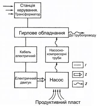 Рисунок 1.13.1 – Структурна схема установки УЕВН: 1 – передача електроенергії; 2 – передача механічної енергії; 3 – плин рідини На відміну від розглянутих раніше в установці заглибного відцентрового електронасоса первинний двигун розташовується у свердловині в безпосередній близькості до багатоступінчастого відцентрового насоса, точніше – під ним. Це дозволяє зменшити довжину механічної трансмісії і передавати насосу значні потужності (до 125-150 кВт), тобто збільшити видобувні можливості цього виду устаткування. Електродвигун і насос об'єднані в один агрегат, який підвішений до колони насосно-компресорних труб, закріплених у верхній частині на усті свердловини. Вздовж колони НКТ прокладено кабель, яким електроенергія підводиться до двигуна. Нафта потрапляє до насосного блока після відокремлення газової фази. Далі вона рухається напірними секціями до колони НКТ. Колоною НКТ нафта рухається до гирлового обладнання.