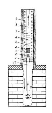 Рисунок 1.4.1 – Обладнання вибою газової свердловини: 1 – експлуатаційний пакер; 2 – циркуляційний клапан; 3 – ніпель; 4 – забійний клапан-відсікач; 5 – розділювач НКТ; 6 – інгібіторний клапан; 7 – аварійний зрізний клапан; 8 – НКТ; 9 – рідкий інгібітор корозії; 10 – хвостовик