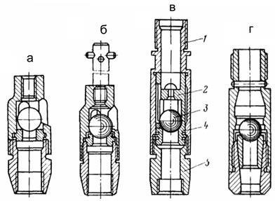 Рисунок 1.6.5 – Клапанні вузли свердловинних насосів: а – насоса НГН1; б – насоса НГН2; в – насоса НГНЗ; 1 – корпус; 2 – стакан; 3 – кулька, 4 – сідло; 5 – наконечник-конус; г – конструкції Костиченка