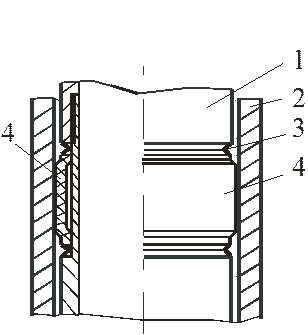 Рисунок 1.6.9 – Пара «плунжер-циліндр» із гвинтовими піскознімними канавками: Стінка циліндра; 2 – плунжер насоса; 3 – піскознімна канавка гвинтового типу; 4 – порожнина між стінкою циліндра та плунжером, що утворилася за рахунок наявності піскознімної канавки