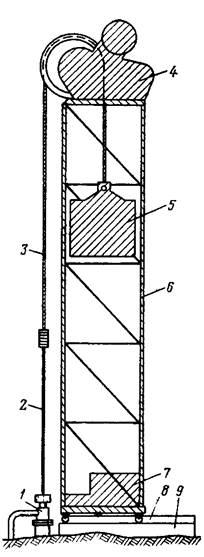 Для досягнення великої довжини ходу штанг (до 10 м) застосовуються спеціальні довгоходові приводи (рисунок 1.7.6). Така установка складається зі сталевої ферми 6, установленої біля устя свердловини. На верхній площадці ферми поміщений привідний двигун із реверсивним редуктором 4, на вихідному валу якого встановлені барабани. Керування двигуном здійснюється станцією 7. Гирловий шток 2 розташований у зовнішній грані ферми і з'єднаний канатною підвіскою 3 з одним із барабанів, на інший барабан намотується канат, до якого підвішений урівноважуючий вантаж 5, який переміщується всередині ферми. В ряді установок застосовуються барабани, що мають на крайніх струмках перемінний радіус, що дозволяє забезпечити зміну швидкості точки підвісу штанг за бажаним законом у період їхнього реверсування.
