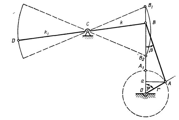 1.7.5 Кінематичний та силовий аналіз роботи приводу свердловинних штангових насосних установок Кінематичний аналіз Дослідження кінематики балансирного верстата-качалки дозволяє визначити, як протягом подвійного ходу змінюються величина шляху, пройденого точкою підвісу штанг, швидкість її руху, прискорення. Перетворюючий механізм балансирних верстатів-качалок являє собою найпростіший плоский механізм першого класу другого порядку (рисунок 1.7.7). Позначимо: кривошип відрізком ОА довжиною Сьогодні широко відомі три способи визначення законів руху елементів балансирного верстата-качалки, що відрізняються підходом до аналізу функціонування перетворюючого механізму. Ці способи, залежно від прийнятих припущень, дозволяють з різним ступенем точності знайти закон зміни переміщення, швидкості і прискорення точки підвісу штанг D. Так називана елементарна теорія основана на наступних припущеннях: перетворюючий механізм верстата-качалки розглядається як звичайний кривошипно-шатунний. Звідси випливає, що точка В рухається по прямій В1, B2 (рисунок 1.7.7).