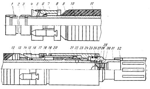 До верхнього фланця корпуса голівки 8 кріпиться корпус сальника 3, у якому розміщені дві набивки. Подібна дворядна конструкція сальника дозволяє заміняти основну набивку без розбирання голівки і розгерметизації внутрішньої порожнини. Набивка 4 стискається грундбуксою 2 і шпильками 1, нижнього ущільнення – грундбуксою 5, переміщення якої здійснюється радіально розташованими запірними болтами 6, що упираються конусними поверхнями в грундбуксу 5. Ущільнення запірних болтів 6 забезпечується ущільненнями сальникового набивання, грундбукси і натискної гайки 7. У процесі експлуатації під навантаженням працює верхнє ущільнення, а нижнє включається тільки на період заміни верхньої набивки. Лубрикатор гирловий (рис. 2.4.1, поз. 2) призначений для спуску в свердловину глибинних манометрів, термометрів і інших приладів, для дослідження без припинення накачування пари в пласт. Лубрикатор встановлюється на фланці верхньої засувки, змонтованої на трійнику арматури гирла. Лубрикатор складається з корпусу, масляного бачка з трубками і блоку. У верхній частині корпусу встановлений вузол сальника, а нижня частина має фланець, за допомогою якого він приєднується до фланця засувки гирлової арматури. Через лубрикатор пропущений дріт, один кінець якого, перекинутий через блок, намотується на барабан лебідки, а до іншого кінцю кріпиться глибинний прилад. Перед проведенням дослідження прилад, прикріплений до дроту, закладається в корпус лубрикатора, після чого він монтується на гирловій арматурі. Перед спуском приладу відкривають кран, і тиск із корпуса по трубі передається в бачок з маслом, що витісняється у вузол сальника. Потім відкривають засувку гирлової арматури і, змотуючи дріт з барабана лебідки, опускають прилад у свердловину. Термостійкі пакери герметизують позатрубний простір свердловини при нагнітанні пари в пласт і захищають експлуатаційну колону від впливу тиску і температури. Одночасно пакери запобігають тепловим втратам і дозволяють знизити температурні напруги. Пакер (рис. 2.4.9) складається з ряду деталей, змонтованих на стовбурі 10. Стовбур 10 з'єднаний муфтою 3 з патрубком 2, який, в свою чергу, з'єднаний з муфтою 1, яка забезпечує з'єднання пакера з колоною НКТ. У верхній його частині розташований шлипсовий вузол для утримання пакера в обсадній колоні і запобігання його зсуву нагору під дією перепаду тиску. Цей вузол складається з конуса 4, шліпсів 7, шліпсотримача 8, обмежника 6 і штифта 5. При спусканні пакеру штифт утримує шліпси від переміщення по направляючим пазах конуса. Після зрізання штифта переміщення шліпсів обмежене деталями 6 і 8. У середній частині пакера розташовані ущільнювальні манжети 11, що закриваються згори захисною шайбою 9, а знизу утримуються натискною гайкою 12. Манжети в залежності від їхнього місця установки виготовлені з різних матеріалів: по двох крайніх – із прогумованої азбесто-металевої тканини, середні – із прогумованої азбестової тканини. У нижній частині стовбура мається шліпсовий вузол, що запобігає переміщенню пакера вниз. Він складається з конуса 13, шлипсів 14 і шліпсотримача 17. Нижче розташований гідроциліндр для посадки пакеру. Привід гідроциліндра здійснюється рідиною, що нагнітається в НКТ. Гідроциліндр складається з власне гідроциліндра 22, зовнішнього 20 і внутрішнього 16 поршнів, перев