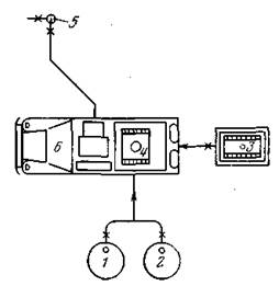Рисунок 2.6.3 – Схема розміщення обладнання при піно-кислотній обробці свердловини: 1 – компресор; 2 – зворотній клапан; 3 – аератор; 4 – насосна установка для закачування кислоти; 5 – арматура гирла свердловини