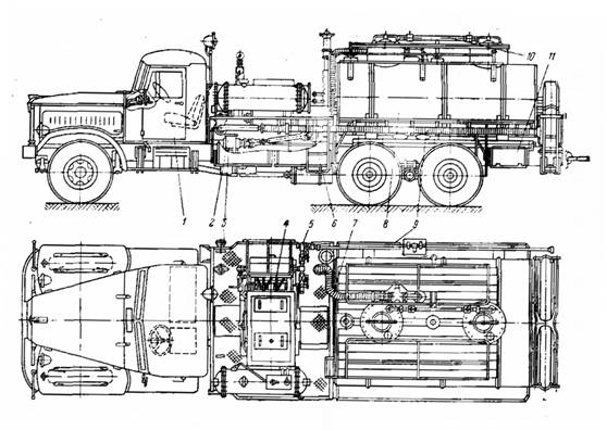 Рисунок 2.6.4 – Агрегат для транспортування та нагнітання кислотного розчину Азінмаш-З0А (УНЦ1-160Х500К): 1 – автомобільне шасі; 2 – коробка відбору потужності; 3 – приймальний трубопровід; 4 – насос 5НК-500; 5 – напірний трубопровід; 6 – редуктор; 7 – приймальний трубопровід; 8 – цистерна; 9 – допоміжний трубопровід; 10 – трубопровід для підведення води з промислової мережі; 11 – ящик для інструментів