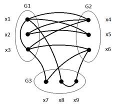 1.1. Последовательный алгоритм декомпозиции Задача: используя последовательный алгоритм распределения элементов выделить в графе G(X, U) три подграфа по три вершины в каждом, таким образом, чтобы общее число связей между подграфами было минимальным. Исходные данные: граф G, разбитый произвольным образом на три подграфа G1, G2, G3. Каждый подграф содержит по три вершины. На основе графа G сформируем матрицу смежности: