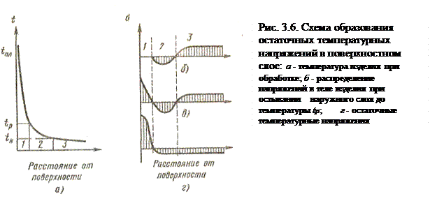 Это рассуждение предполагает, что деформируемый слой не находится даже частично в состоянии ползучести. В зависимости от температуры металл может быть в упругом и пластичном состояниях. В состоянии ползучести металла силы упругости не проявляются, и деформация протекает без стремления материала к восстановлению формы. За температуру рекристаллизации (tp), то есть перехода из упругого состояния металла в пластическое, можно принять 450°С для углеродистых сталей и 550°С для легированных. Средняя температура поверхностного слоя стали при шлифовании составляет 300 – 400°С, у самой поверхности 800 – 850°С. Температуры того же порядка развиваются при скоростном точении. Нагрев поверхностного слоя металла при обработке обусловливает образование в нем температурных напряжений. Допустим, что в процессе обработки цилиндрической детали слой 1 (рис. 3.6) находится в состоянии ползучести. В этом слое внутренние напряжения отсутствуют, а если до того существовали остаточные напряжения, то они снимаются. В слое 2 с температурой ниже tp, но выше нормальной tн возникают напряжения сжатия, а в слое 3 – напряжения растяжения. Напряжения эти временные. Как только наружный слой охладится до температуры tp, он станет упругим. Встречая сопротивление сокращению, он оказывается растянутым в окружном направлении. В слое 2 сжимающие напряжения возрастают. При дальнейшем охлаждении до полного выравнивания температуры по глубине металла напряжения растяжения в слое 1 возрастают, а в слоях 2 и 3 устанавливается система уравновешивающих напряжений сжатия. По характеру остаточные температурные напряжения, равно как и обусловленные пластической деформацией, являются напряжениями первого рода. Однако из-за неодинакового тепловыделения на смежных участках обрабатываемой поверхности и различной степени пластической деформации возникают также остаточные напряжения второго рода. Итак, при обработке металла в его наружном слое под влиянием пластической деформации при отсутствии ползучести развиваются остаточные напряжения сжатия, тепловой же эффект от резания приводит к напряжениям растяжения. Так как оба фактора действуют совместно, то знак остаточного напряжения в наружном слое зависит от того, какой из факторов превалирует. Разумеется, если температура на обрабатываемой поверхности менее tp, то температурные напряжения являются временными, после выравнивания температуры они исчезают. Пластическая деформация, в том числе и при резании металлов, обусловливает изменение микроструктуры. Беспорядочно расположенные в исходной структуре металла кристаллические зерна при пластической деформации приобретают однородную ориентацию (текстуру). Более глубокие изменения возможны при обработке металлов, воспринимающих закалку. Так как каждой структурной составляющей свойствен присущий ей удельный объем, то фазовые и структурные превращения наряду с пластической деформацией являются источником остаточных напряжений. Местные фазовые и структурные превращения поверхностного слоя шлифуемой детали известны под названием шлифовочных прижогов. Они образуются вследствие интенсивного (почти мгновенного) тепловыделения на небольшом участке поверхностного слоя. При шлифовальном круге нормальной твердости, нормальном режиме шлифования и достаточном охлаж