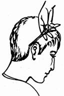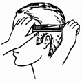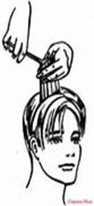 | Расчесать волосы, выделить ровным пробором прядь, стричь, выделяя пряди снова и снова. Простричь всю теменную зону