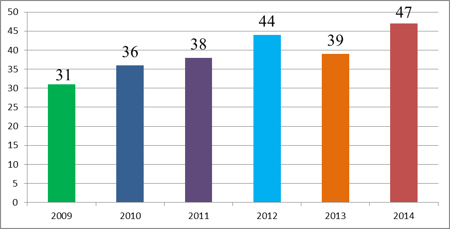 На представленной выше диаграмме отмечается рост численности пациентов с анафилактическим шоком. В 2013 году, однако, произошел небольшой спад в 6 человек, по сравнению с 2012 годом, после чего снова произошло резкое увеличение количества пациентов. Пик встречаемости пришелся на 2014 год.