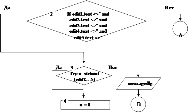 5. процедура добавления записи: button1click. Пояснения к алгоритму 5: Блок 2 – проверка edit -ов на не пустые строки. Блок 3 – попытка присвоить строке целочисленные переменные. сообщение о необходимости полей 2…5 быть числом. Блок 4 – задание начального условия цикла. Блоки 5, 6 – цикл очистки типового массива. Блок 7 – задание начального условия цикла. Блоки 8, 9, 10 – цикл перевода строки StringGrid в массив записей. Блок 11 – задание начального условия цикла. Блоки 12, 13, 14 – цикл нахождения количества записей больших добавленного значения. Блок 13 – выполнение условия сравнения текстовых переменных. Блоки 15, 16 – междустрочное добавление записи в массив. Блок 17 – вызов процедуры. Блок 18 – задание начального условия цикла. Блоки 19, 20, 21, 22, 23 – цикл перевода массива в StrinпGrid. Блок 24 – вызов процедуры очистки edit -ов. Блок 25 – вызов процедуры авторасчета. сообщение о необходимости всех полей к обязательному заполнению.