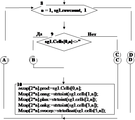 Пояснения к алгоритму 9: Блок 2 – очистка выбранной строки. Блок 3 – задание начального условия цикла. Блоки 4, 5 – повторный цикл очистки массива. Блок 6 – задание начального условия цикла. Блоки 7, 8, 9 – повторение цикла перевода строки StrinGrid в массив записей. Блок 10 – задание начального условия цикла. Блоки 11, 12, 13, 14, 15 – повтор цикла перевода массива в StrinGrid. Блок 16 – расчет.