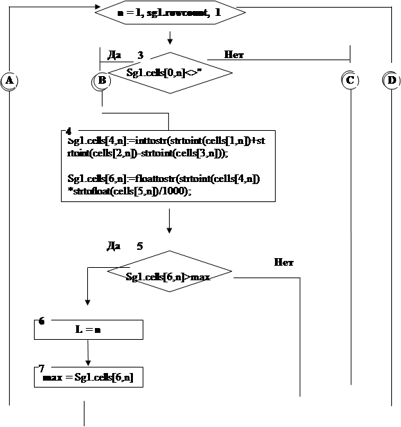 Пояснения к алгоритму 6: Блок 2 – формирование цикла. Блок 3 – условие математического расчета (при не пустой ячейке - выполняется). Блок 4 – выполнение математических расчетов. Блоки 5, 6, 7 – поиск максимального элемента. Блок 8 – вывод в поле memo наименование статьи с наибольшим значением.