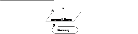 Пояснения к алгоритму 8: Блоки 2, 3 – открытие для чтения данных. Блок 4 – задание начального условия цикла. Блоки 5, 6 – повторный цикл очистки массива. Блоки 7, 8, 9 – чтение из типизированного файла в типизированный массив. Блок 10 – вызов подтверждения очистки StringGrid. Блок 11 – задание начального условия цикла. Блоки 12, 13, 14, 15, 16 – повтор цикла перевода массива в StringGrid. Блок 17 – вызов процедуры расчета. Блок 18 – вывод в поле memo подтверждения.