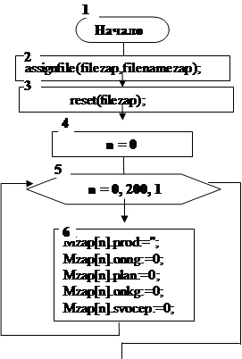 Пояснения к алгоритму 7: Блоки 2, 3 – открытие для записи данных. Блок 4 – задание начального условия цикла. Блоки 5, 6 – повторный цикл очистки массива. Блок 7 – задание начального условия цикла. Блоки 8, 9, 10 – повторение цикла перевода строки StringGrid в массив записей. Блоки 11, 12 – запись в файл. Блок 13 – закрытие файла. Блок 14 – вывод в поле memo подтверждения.