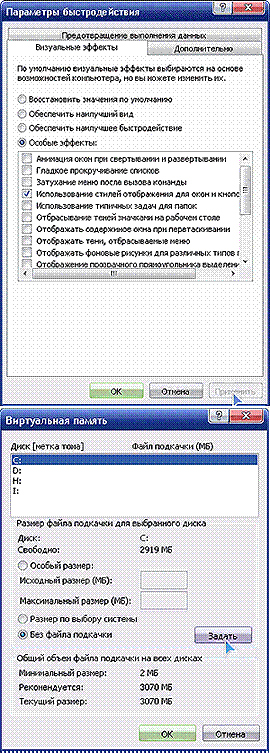 На слабых машинах или если нужно достичь максимального быстродействия лучше всего отключить все визуальные излишества (отметить пункт «обеспечить наилучшее быстродействие»), но в этом случае интерфейс Windows XP станет таким как у Windows 2000. Не забудьте нажать кнопку «применить». - Теперь в панели «параметры быстродействия» переходим на вкладку «дополнительно». Здесь в пунктах «распределение времени процессора» и «использование памяти» ставим галочки возле «программ», нажимаем кнопку «применить». После этого в пункте «виртуальная память» жмем кнопку «изменить».