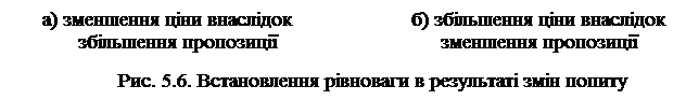 Аналіз взаємодії попиту і пропозиції (рис. 5.5) показує, що на ринку можуть виникнути наступні ситуації: 1. Ринкова рівновага – це стан ринку, за якого обсяги попиту та пропозиції збігаються. Криві попиту і пропозиції перетинаються в точці Е. Стану рівноваги відповідають певні значення рівноважної ціни – Р0 та рівноважного обсягу продаж – Q0. Отже, умова рівноваги ринку – Q0 = QS = QD, тобто сумарна кількість запропонованого товару відповідає сумарному попиту на цей товар. За таких умов ринок збалансований і ні у споживачів, ні у виробників немає стимулів для її порушення. За ціни рівноваги не існує причин для її зміни. 2. Дефіцит блага – ситуація, коли ринкова ціна установлюється нижче від рівноважної ціни, а обсяг попиту перевищує обсяг пропозиції, тобто бажання покупців перевищують кількість запропонованого товару, споживачам треба міняти свої плани. На рис. 5.5 дефіцит утворюється при ціні Р1, яка менш рівноважної Р0, а обсяг попиту Q1D більш обсягу пропозиції Q1S. 3. Надлишок блага – ситуація, коли ринкова ціна установлюється вище від рівноважної ціни, а обсяг пропозиції перевищує обсяг попиту, за таких умов продавці мають змінювати свої плани За умови відхилення ринковий ціни від рівноважної у ринкових суб’єктів з’являються стимули до змінювання ситуації. Якщо ціна відхиляється вгору від рівноважної, з’являється надлишок товарів у продавців, загострення конкуренції змушує їх знижувати рівень ціни до рівноважного, а якщо ціна опустилась нижче за рівноважну, то виникає дефіцит товарів і, користуючись конкуренцією серед покупців, продавці піднімають ціну. Отже, зміна ціни повертає ринок до попередньої рівноваги, тобто коливання ціни відіграє роль механізму саморегулювання ринкової системи: наявність дефіциту товару підвищує ціну, а наявність надлишок – знижує ціну. Рівновага окремого ринку певного товару називається частковою рівновагою, а точка ринкової рівноваги стійка. Але, рівновага може змінитися під впливом будь-якої з нецінових детермінант. Зміна під впливом нецінових детермінант попиту чи пропозиції призводить до виникнення нового стану рівноваги (рис. 5.6). При цьому нові рівноважні ціна і обсяг можуть як зростати, так і зменшуватися в одному чи в протилежних напрямках, точка рівноваги переміщується в нове положення, а ринкова система набуває нової рівноваги з іншими параметрами P0* та Q0*. Якщо одночасно зростають (скорочуються) і попит, і пропозиція, рівноважний обсяг продукції зросте (скоротиться), але вплив на рівноважну ціну є невизначеним, він залежить від ступеня взаємних змін попиту та пропозиції. Рівноважна ціна зменшиться, якщо попит зросте в меншій мірі, ніж пропонування, і зросте, якщо попит зростає в більшій мірі, ніж пропонування. Пристосування ринку до змінювань у попиті демонструє рис. 5.6, пропозиція незмінна.