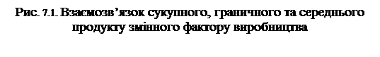 При збільшенні використання змінного фактора виробництва – L – за незмінних інших, фірма за допомогою виробничої функції може дослідити наскільки зростає і чи зростає взагалі обсяг виробництва протягом певного періоду. При цьому обсяг випуску розглядається як результат продуктивності змінного фактора. Взаємозв’язок показників ТРL, АРL, МРL та обсягу використання змінного фактора виробництва ілюструє рис.7.1 (графіки функцій сукупного, середнього та граничного продуктів праці побудовані за допомогою показників гіпотетичного підприємства). Конфігурація кривої сукупного продукту ТРL ілюструє нерівномірність приростів випуску продукції. Початкова опуклість функції донизу показує, що до точки С обсяг продукції зростає швидше, ніж обсяги ресурсу. Праворуч від точки С крива стає опуклою вгору – це означає, що зростання обсягу випуску уповільнюється з кожною додатково залученою у виробництво одиницею праці. Сукупний продукт збільшується разом зі збільшенням змінного фактора L досягає у точці A найбільшого значення, потім збільшення припиняється. Тобто виробничий процес настільки перенасичений цим фактором виробництва, що він не може ефективно використовуватися.