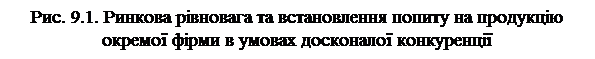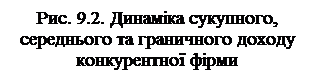 Крива ринкового попиту галузі є типовою спадною кривою, попит окремої фірми є абсолютно еластичним, тобто конкурента фірма є «ціноотримувачем». Особливості попиту на продукт конкурентної фірми виявляються через динаміку основних показників доходу фірми. До таких показників належать: 1. Сукупний дохід – виручка від продажу певної кількості товару: TR=P Оскільки на ринку досконалої конкуренції ціна є сталою (P=const), то сукупний дохід є лінійною функцією відносно обсягу проданої продукції (рис. 9.2). 2. Середній дохід – це виторг від реалізації одиниці продукції: AP = тобто середній дохід дорівнює ринковій ціні, а крива середнього виторгу співпадає з кривою попиту (рис. 9.2). 3. Граничний дохід – це приріст сукупного доходу в результаті продажу додаткової одиниці продукції: