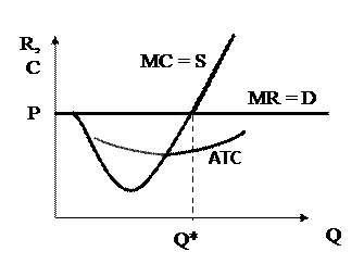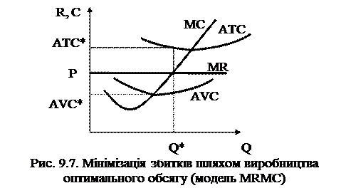 На рис. 9.6 графічно показано ситуація, коли ринкова ціна Р дорівнює мінімальним середнім сукупним витрати АТСmin. У цьому випадку фірма отримує нормальний прибуток, який включений у витрати і має нульовий економічний прибуток. У цій ситуації фірма працює з найбільшою ефективністю, оскільки середнім сукупним витрати найменші. Умова беззбитковості фірми: P = ATC* 3. Фірма мінімізує збитки шляхом виробництва. На рис. 9.7 графічно показано ситуація, якщо випускати продукцію на рівні Q*, то фірма буде покриває свої змінні витрати і частину постійних. Якби вона за цієї ситуації припинила свою діяльність, то її збитки були би більшими і дорівнювали б постійним витратам, яких не можна позбутися у короткостроковому періоді.