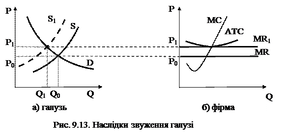 Якщо фірми в галузі в якомусь короткостроковому періоді мають збитки, частина з них спробує більш вигідно використати ресурси і вийде з галузі. Зменшення кількості фірм в галузі приведе до зменшення пропозиції товару при незмінному попиті, ціна на ринку підвищиться, що ліквідує збитки. Процес виходу фірм з галузі буде продовжуватися до тих пір, поки ціна не досягне значення ATCmin. Тобто фірма не зможе отримати економічний прибуток, а лише нормальний (рисунок 9.13).