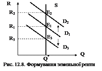 Оскільки зміна розміру ренти ніяк не впливає на кiлькiсть землі, що пропонується для використання, то рента не виконує спонукальної функції (як то має місце на ринку інших ресурсів). Тому економісти вважають ренту надлишком, тобто платою, яка не є обов’язковою для забезпечення наявності землі. Земля має різну природну родючість, тому одна й та сама праця чи капітал у поєднанні з різними за родючістю землями приносить рiзнi результати. Додатковий прибуток, який отримують користувачі родючої землі за інших рівних умов, називається диференціальною рентою. Рис. 12.9 ілюструє формування розміру ренти, яку отримують власники земель з кращими властивостями.