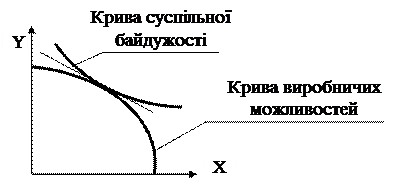 Отже, рівновага встановлюється у точці дотику кривої суспільної байдужості до кривій виробничих можливостейта лінії співвідношення цін