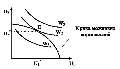 Ресурси у суспільстві можуть бути розподілені оптимально за Парето, навіть якщо одні голодують, а інші живуть у розкоші. Про те свідчить крива споживацьких можливостей (див. рис. 13.4): у точці А всі блага суспільства зосереджені у суб’єкта М, корисність якого досягає максимуму за даних наявних ресурсів, а суб’єкт N не має жодного блага, його корисність є нульовою. У точці В ситуація протилежна – суб’єкт N володіє всіма ресурсами споживання, а ресурси споживання і корисність суб’єкта М дорівнюють нулю. Обидві точки А і В є ефективними за Парето. Таким чином, оптимальний за Парето розподіл ресурсів може не надавати соціального оптимуму, допускаючи крайню нерівномірність розподілу наявних благ у суспільстві. Неефективний розподіл ресурсів іноді може бути більш справедливим, ніж ефективний. Справедливість – певна ідея про те, як мають розподілятися блага та добробут у суспільстві. Справедливий розподіл – розподіл, який одночасно є рівноправним і Парето ефективним. Рівноправний розподіл – це розподіл, за якого жоден з індивідів не буде віддавати перевагу набору товарів іншого індивіда. Проблема справедливості та ефективності (продуктивної праці, яка ефективно використовує обмежені ресурси) полягає в основі теорії добробуту. Теорія суспільного добробуту – розробка критерію бажаності або небажаності певного стану економіки. Вона вивчає оптимальний розподіл товарів і послуг між людьми та економічних ресурсів між галузями економіки. Добробут – забезпеченість населення необхідними матеріальними та духовними благами, яка виражається системою показників, які характеризують рівень життя. Модель економіки з двома економічними суб’єктами, крива можливих корисностей демонструє безліч варіантів Парето – оптимального розподілу ресурсів, а кожна її точка відповідає одному з ефективних варіантів розподілу добробуту між членами суспільства. Водночас всі варіанти вибору різняться з точки зору справедливості розподілу добробуту. З множини варіантів суспільство може реально реалізувати лише один. Конкрентний вибір пов’язаний з конкрентним поглядом на проблему справедливості, який і визначає функцію суспільного добробуту. Функція суспільного добробуту – це функція, що узагальнює індивідуальні функції корисності з врахуванням уподобань індивідів, вона має загальний вигляд: W=W[U1(X), …, Un(X)], Де W – рівень суспільного добробуту U1(X), …, Un(X) – функції корисності окремих індивідів. Існують численні різновиди функцій суспільного добробуту. На початку 40-років XX ст. була запроваджена функція суспільного добробуту Бергсона-Семюелсона (індивідуалістична), яка відображає індивідуальні уподобання і відповідні рівні корисності окремих індивідів відносно деяких станів суспільного розподілу благ: W=W[U1(X1), …, Un(Xn)], де X1… X n – набори благ конкурентних індивідів. Індивідуалістична функція ґрунтується на ординалістської теорії, відображає індивідуальні уподобання і відповідні рівні корисності окремих індивідів відносно певних наборів споживачів благ.