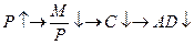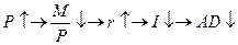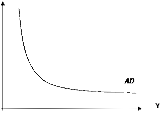 Крива AD – спрямована вниз, оскільки зростання Сукупний попит залежить від ціни опосередковано, яка визначається за допомогою трьох факторів: ефектом відсоткової ставки (ефект Кейнса); ефектом реальний касових залишків (ефект Пігу); ефектом імпортних закупок. Зазначені фактори називаються ціновими і від них залежить ухил AD. 1. Ефект Кейнса (ефект відсоткової ставки) виражається в тому, що із зростанням цін зростає попит на гроші: при незмінній пропозиції грошей починає зростати ставка відсотка. Таким чином скорочується обсяг інвестицій в економіку, а отже, знижується сукупний попит.