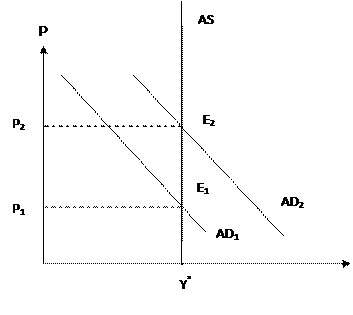 Коливання сукупного попиту впливають на обсяг виробництва, рівень цін не змінюється. Наприклад, збільшення пропозиції грошей зміщує AD1 у положення AD2. Економічна рівновага переміщується з точки Е1 в Е2, обсяг виробництва – з точки Y1 в точку Y2 (рис. 4.6.). Відмінність короткострокової кривої AS від довгострокової пояснюється недосконалістю ринку, тобто негнучкістю цін і номінальної зарплати.
