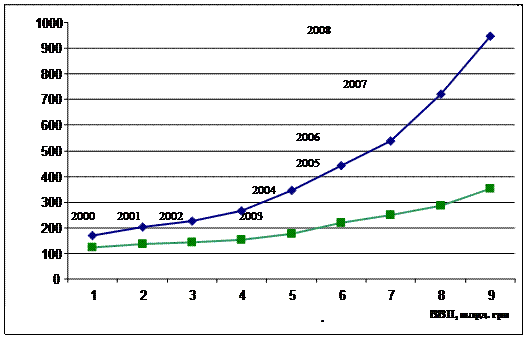 Рис. 4.9. Зростання сукупної пропозиції (ВВП) в Україні за 2000–2008 рр. залежно від динаміки рівня цін та динаміки обсягу виробництва В табл. 4.2 і рис 4.9 наведені дані і побудована крива зростання сукупної пропозиції (ВВП в Україні за 2000–2008 рр.) залежно від динаміки рівня цін та динаміки обсягів виробництва.