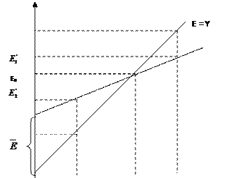 На горизонтальній осі графіка представлено ВВП (Y), а на вертикальній – фактичні витрати Бісектриса відображає всі точки, в яких ВВП дорівнює запланованим сукупним витратам. Перетин ліній фактичних і запланованих сукупних витрат в точці Т0 свідчить про рівність цих витрат Е =