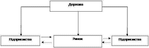 Рис. 11.1. Державне управління централізованою економікою Ринкова змішана система господарювання – це та система, в якій держава виконує тільки макроекономічне регулювання ринків. При цьому суб’єкти господарювання мають приватну, колективну чи інші форми власності. На рис. 11.2. наведена схема змішаної ринкової економіки.