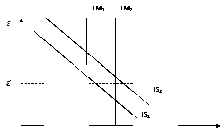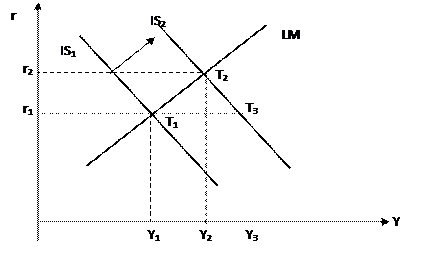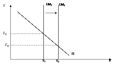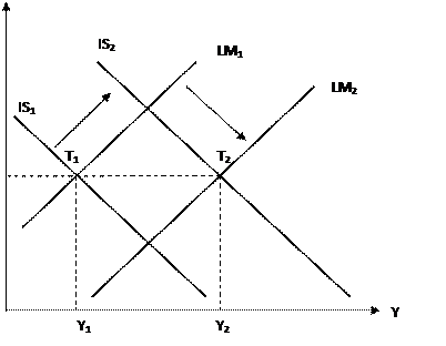 Якщо відсоткова ставка була б незмінною, то дохід збільшився б до Y3. Оскільки відсоткова ставка зросла від r1 до r2, то це скорочує приватні інвестиції та зменшує зростання доходу до Y2. Скорочення приватних інвестицій при стимулюючій фіскальній політиці називається ефектом витіснення. Припустимо, що центральний банк збільшив пропозицію грошей за незмінної фіскальної політики.